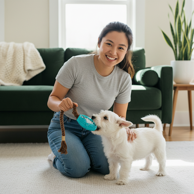 This toy is a lifesaver for teething puppies. The rubber fins massage gums and soothe discomfort. Our puppy now loves dental care!