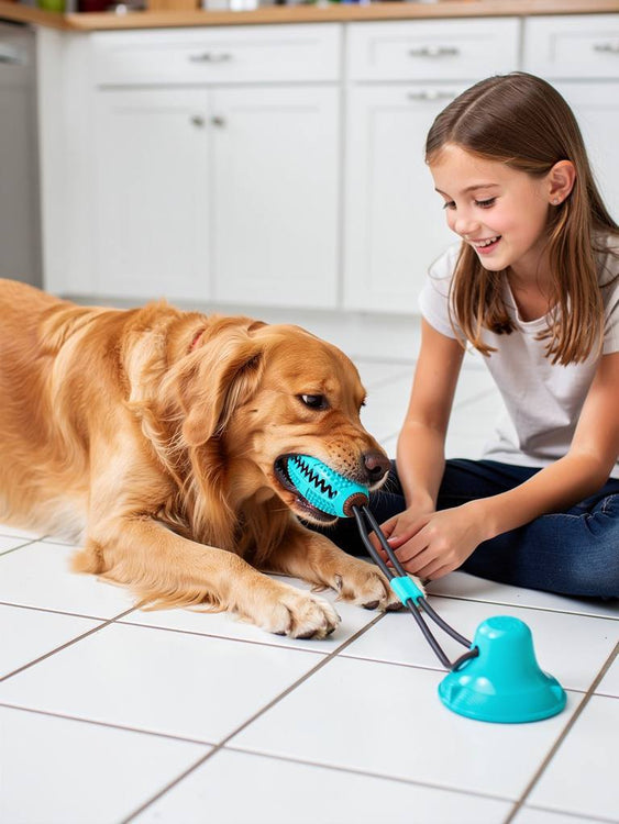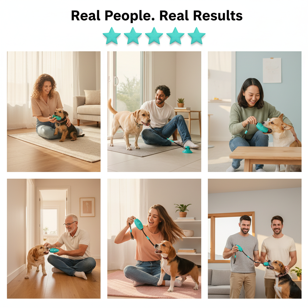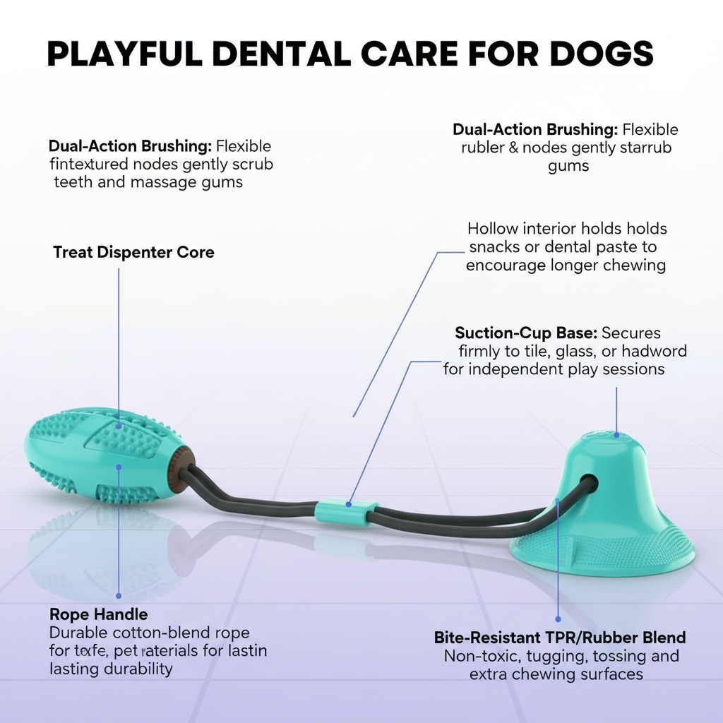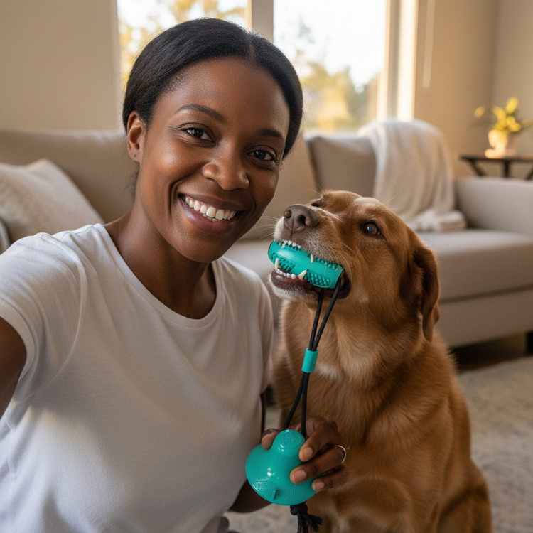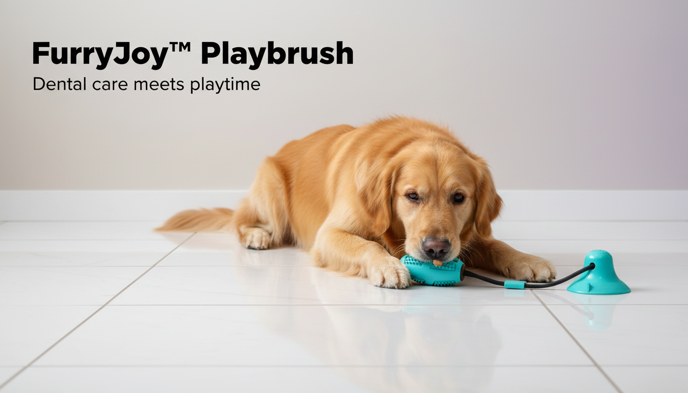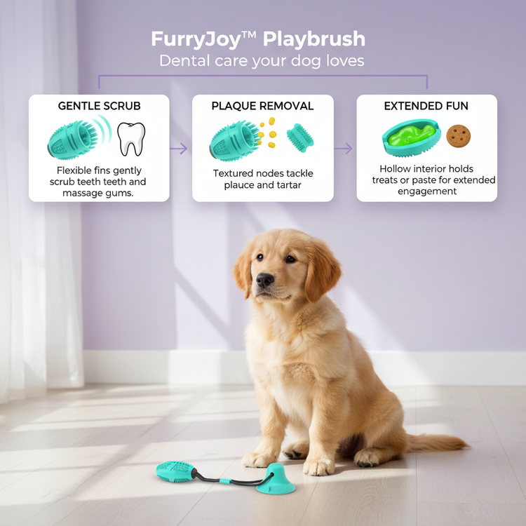 Watch dogs enjoy their Playbrush toy while cleaning their teeth and massaging gums. These real-life snapshots show how the flexible fins and treat-holding design keep pups engaged and healthy.