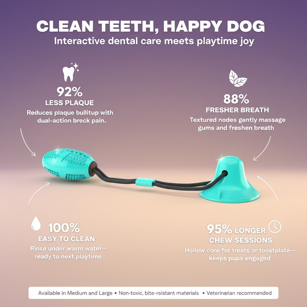 Flexible rubber fins gently scrub teeth and massage gums. Textured nodes tackle plaque and tartar. The hollow core holds toothpaste or treats for extended engagement.